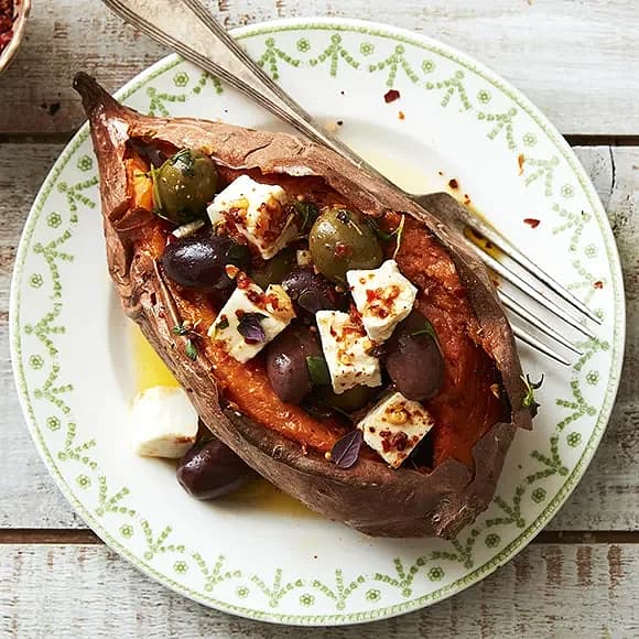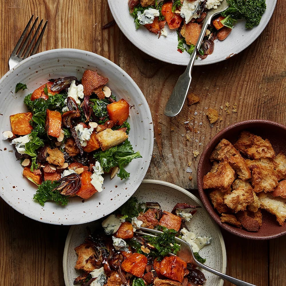 Kycklingspett med rostad sötpotatissallad och chilimajonnäs