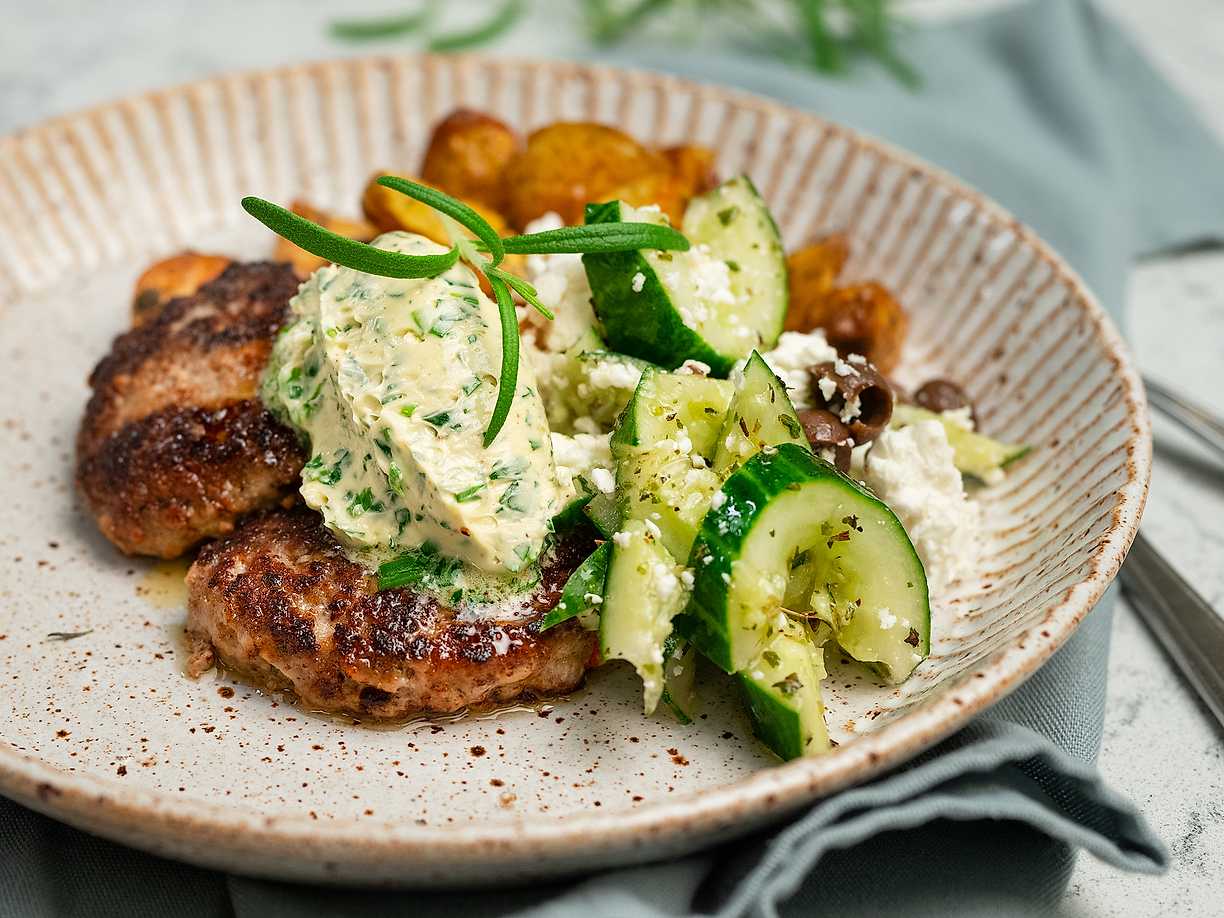 Lammfärsbiffar med timjanpotatis och vitlökssmör