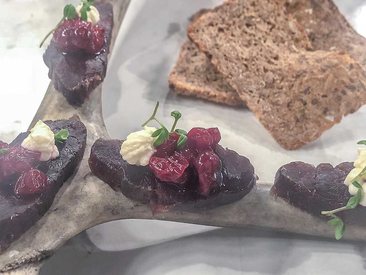 Whiskygravat renkalvinnanlår med surdegskrutonger och lingon