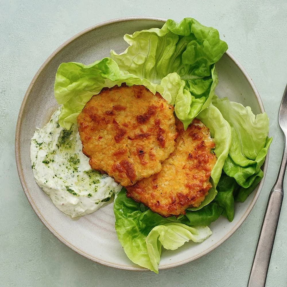 Bulgur- och halloumifritters med pestokräm