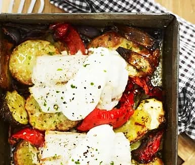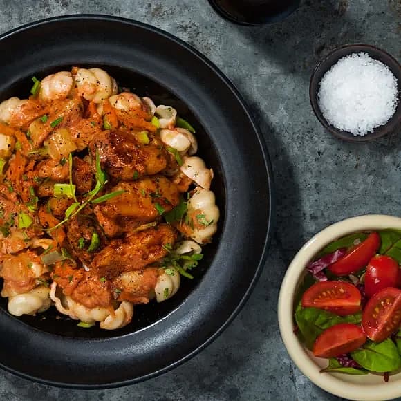 Gyllenstekt gnocchi med medelhavsgrönsaker och bejkon