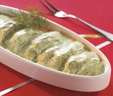Gratinerad rotselleri i gräddig vitvins- och senapssås
