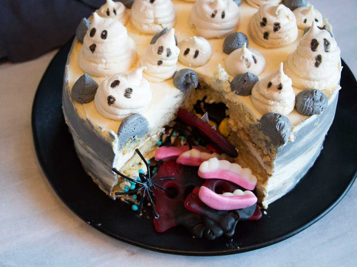 Halloweentårta med godisgömma och spökmaränger