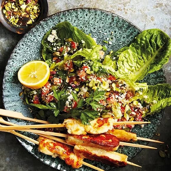 Blomkålstabbouleh med halloumispett och tomatsås