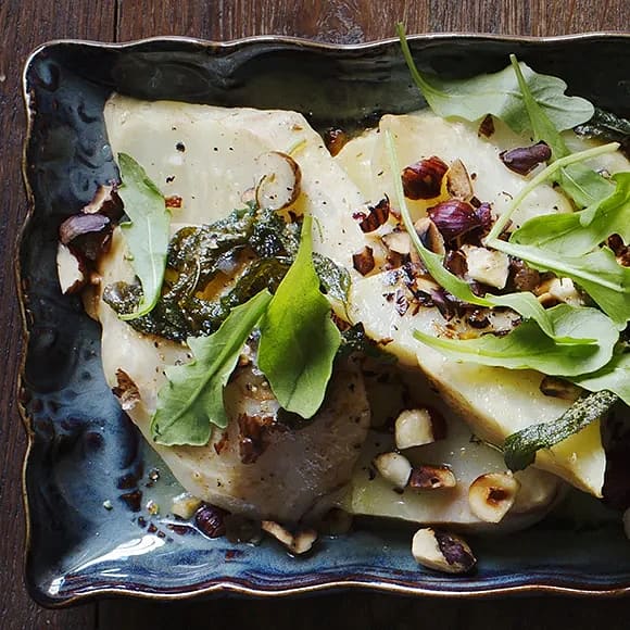 Bakad rotselleri med brynt salviasmör och hasselnötter