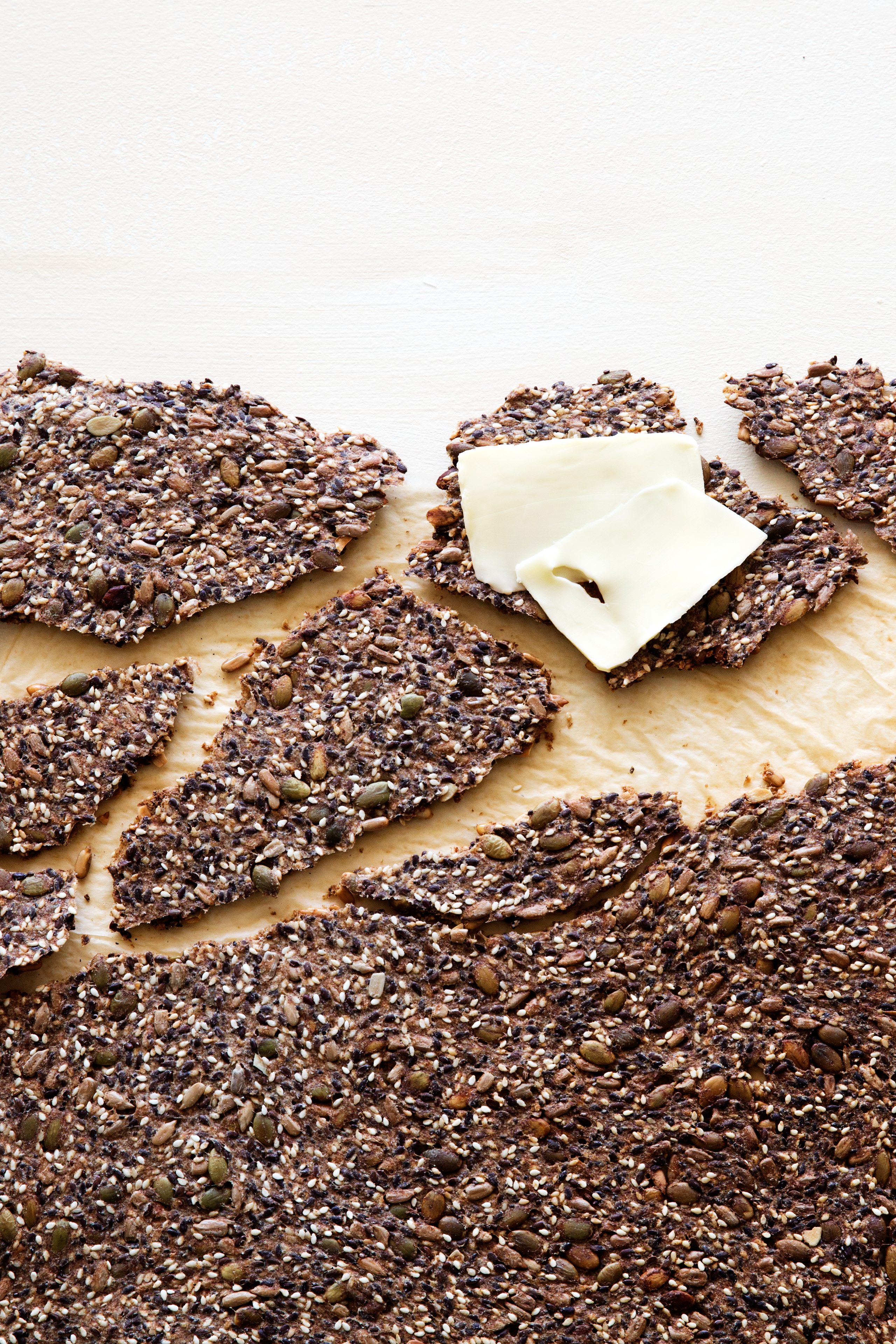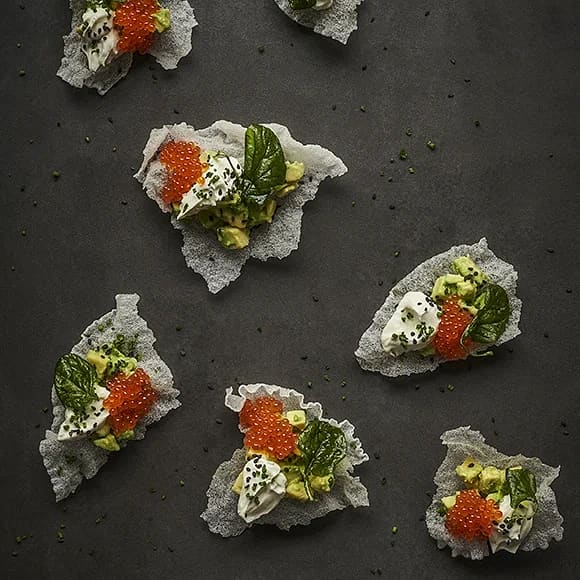 Krispiga snittar med friterat rispapper, avokado och rom