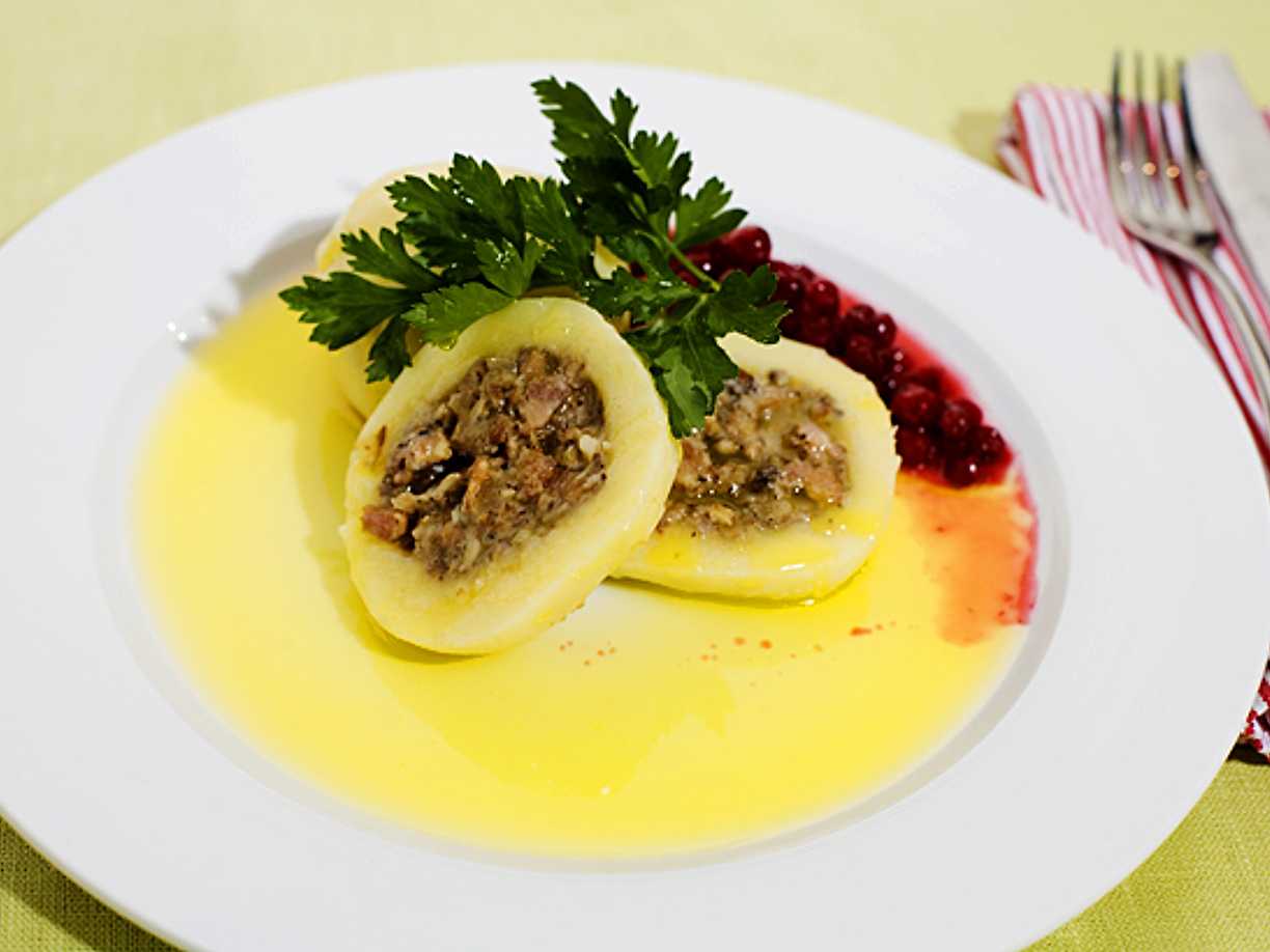 Örtstekt lammsadel med portvinssås och getostduchesse