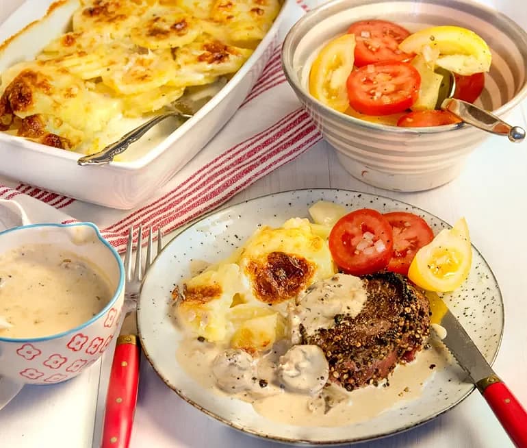 Rostade och rökta potatisar med ölkaramelliserad lök