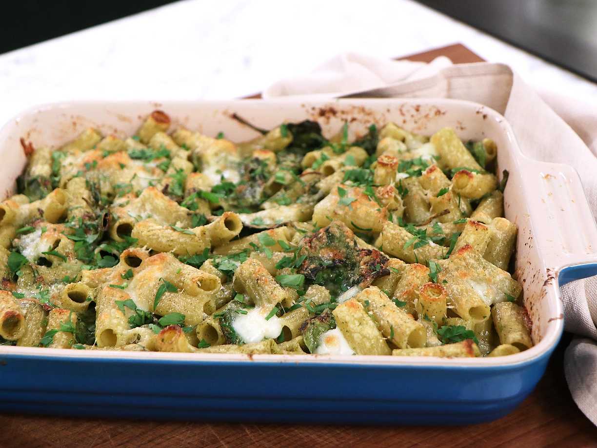 Pasta med bönpesto och vitlöksstekta champinjoner