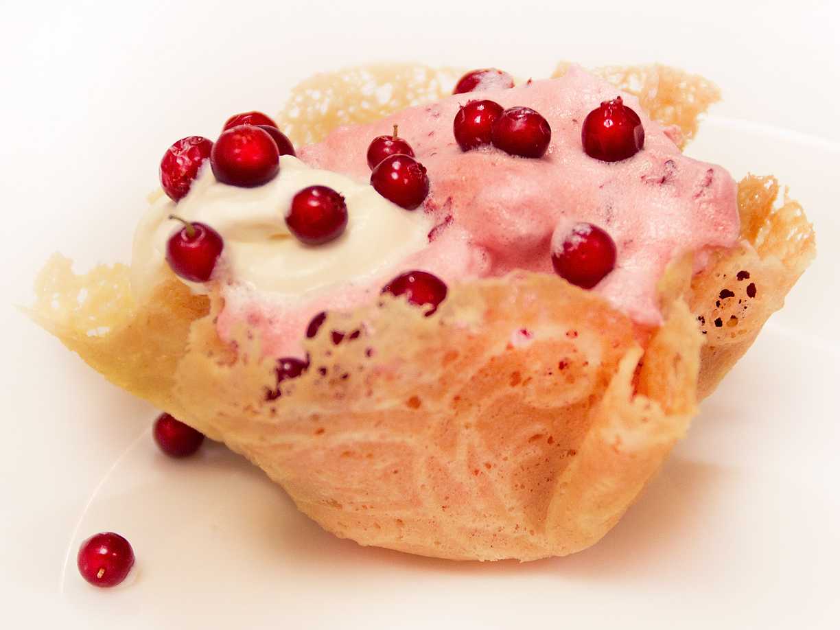 Crème brûlée med kaffesmak, rabarber-is och bär