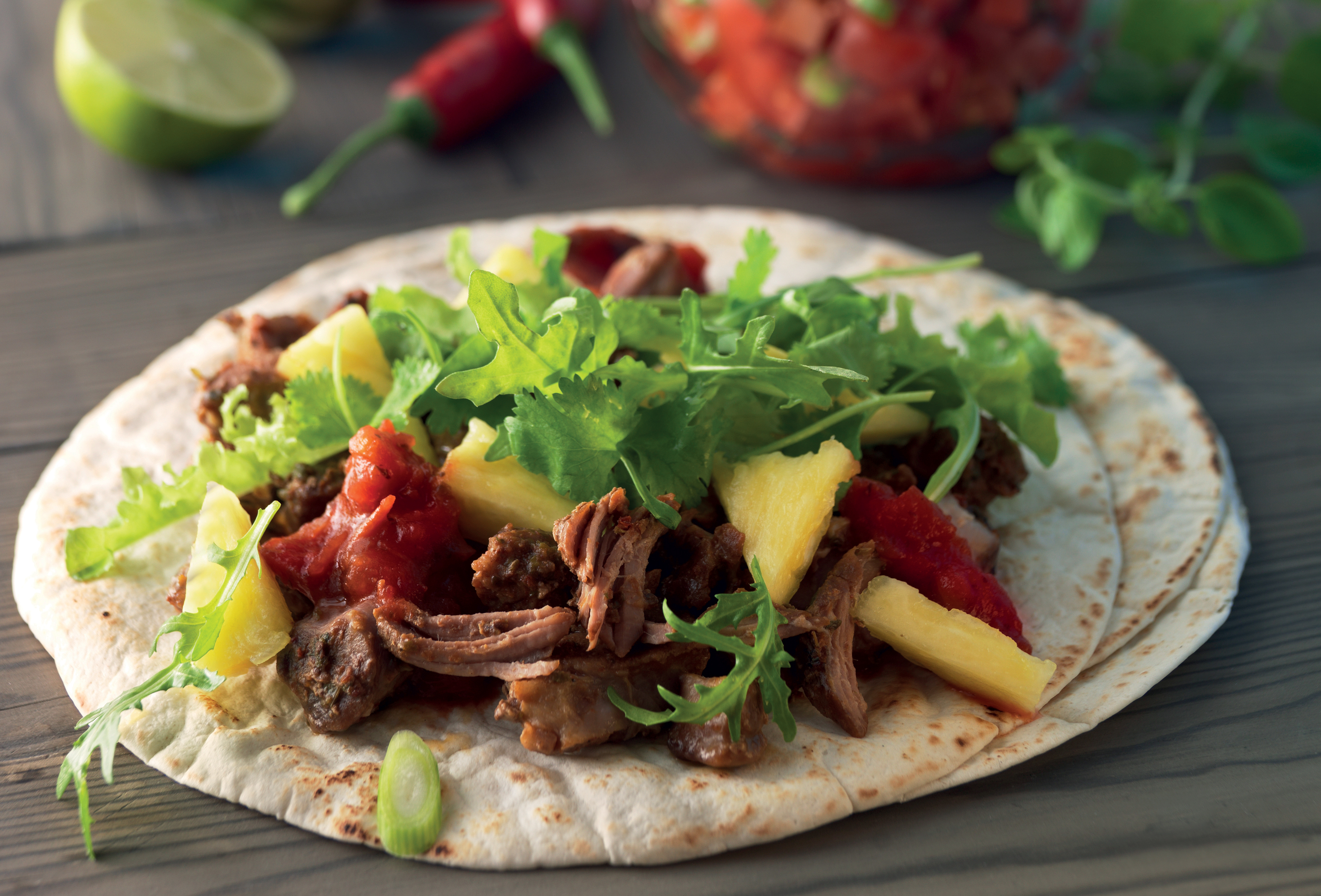 Fläskkarré med grillad spetskål, rostad färskpotatis, tomatsalsa och aioli