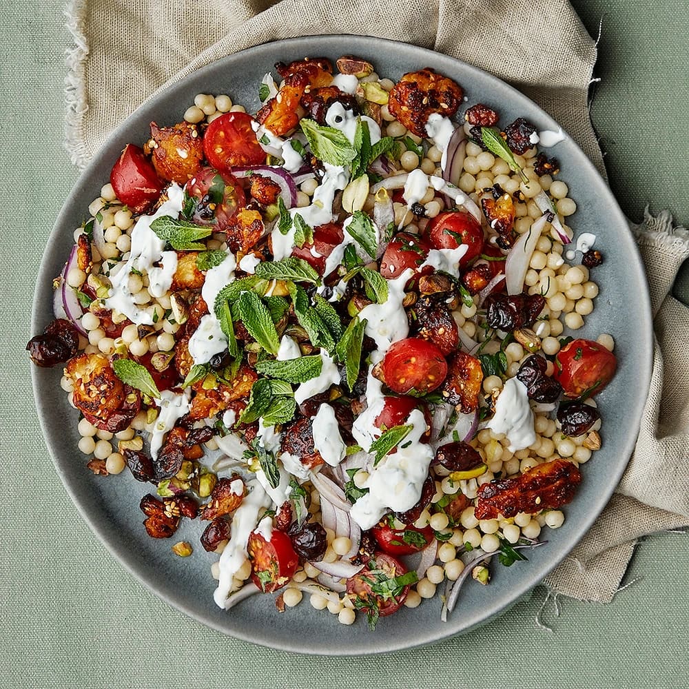 Pärlcouscous med sesamstekt halloumi och myntayoghurt