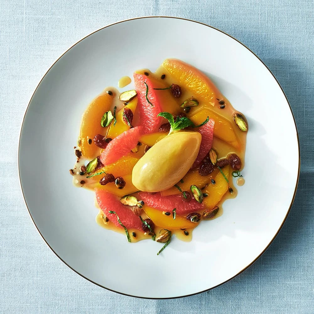 Citrussallad med mangosorbet och pistagenötter