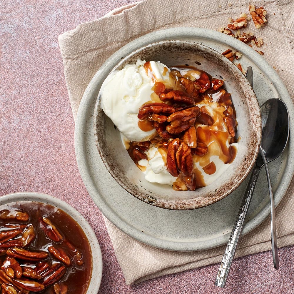 Salt pecankolasås med vaniljglass