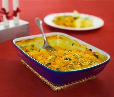 Helstekt kalkon fylld med ris, äpple, svamp och gula russin