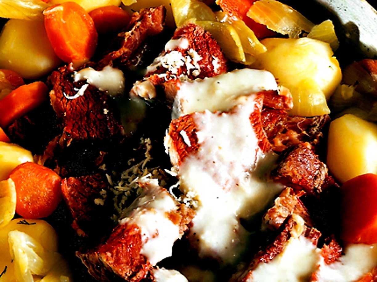 Porchetta på kalkon med lyxig pytt och balsamicosås