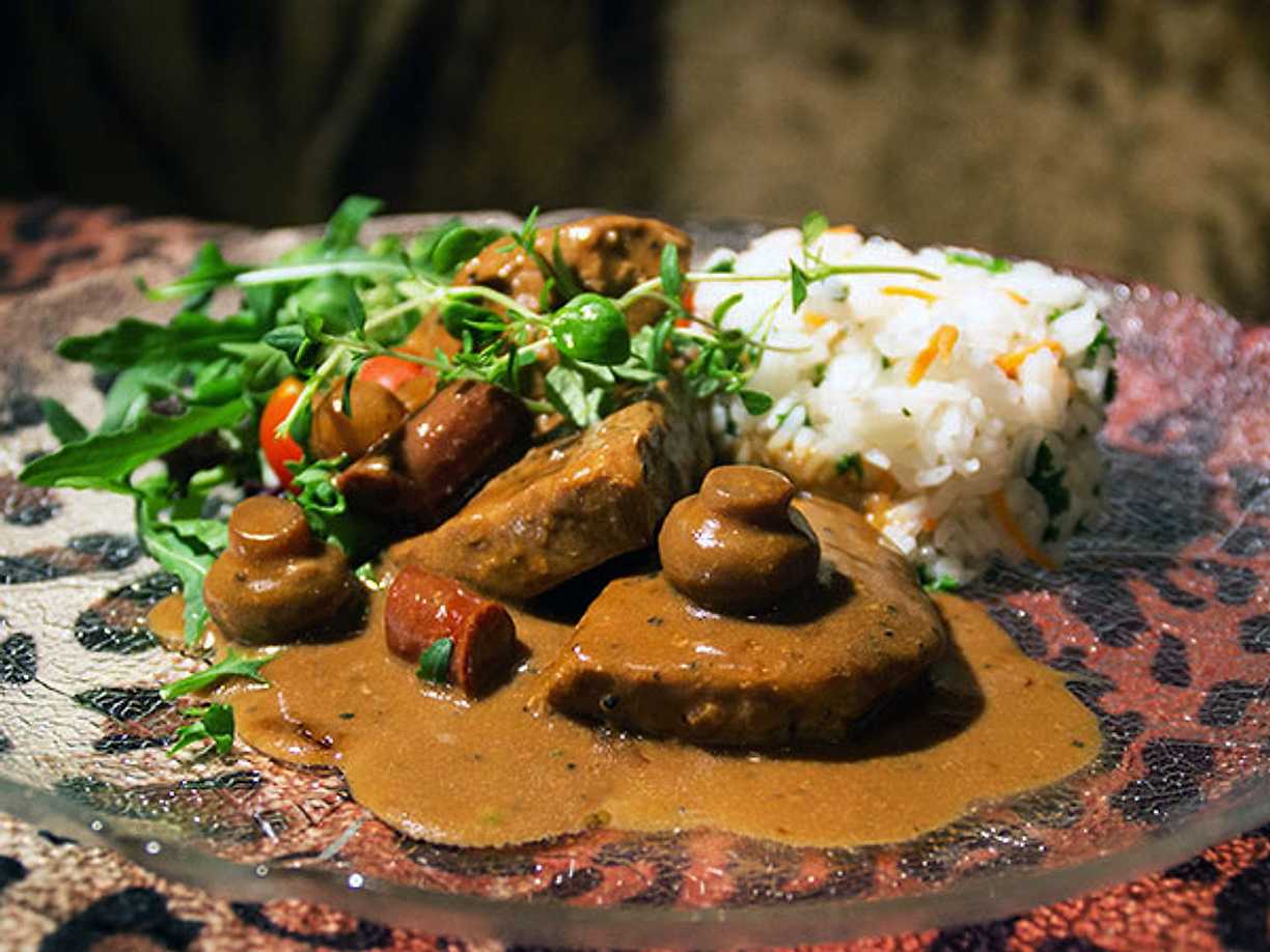 Kalkonfilé med rotsakspuré och sötsyrlig lök