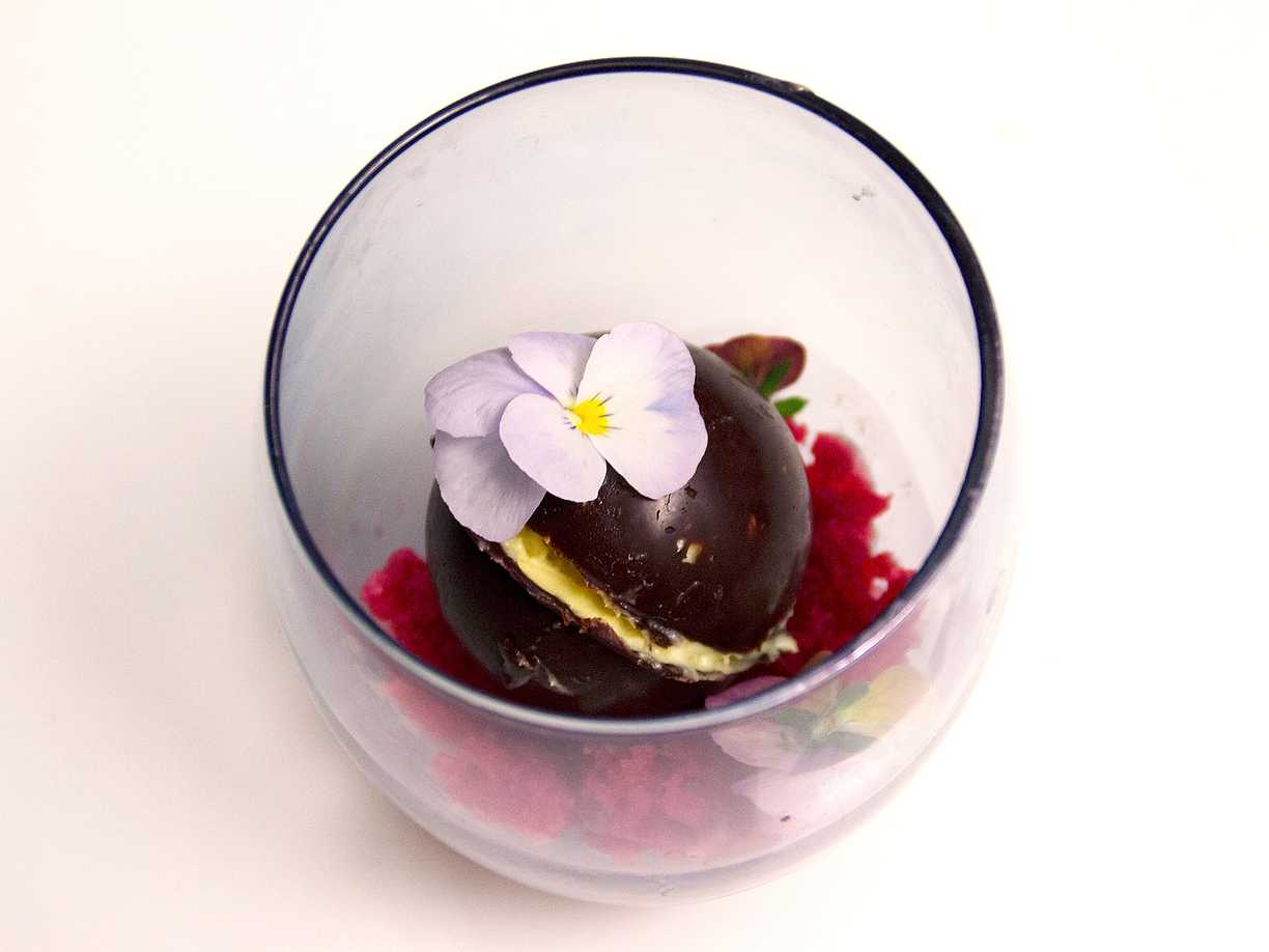 Sviss med kladdkaka, kolasås och ingefärspäron