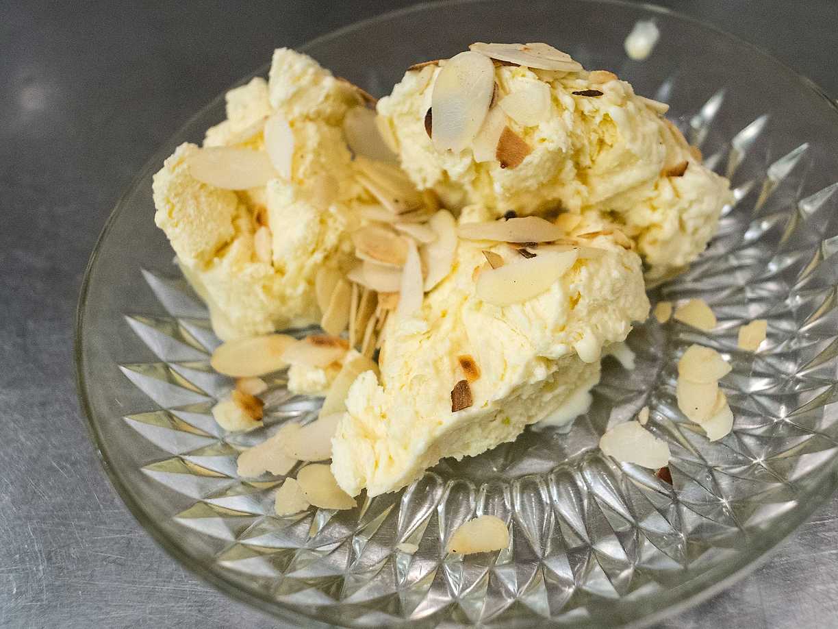 Fryst portvinskräm med mandelspån