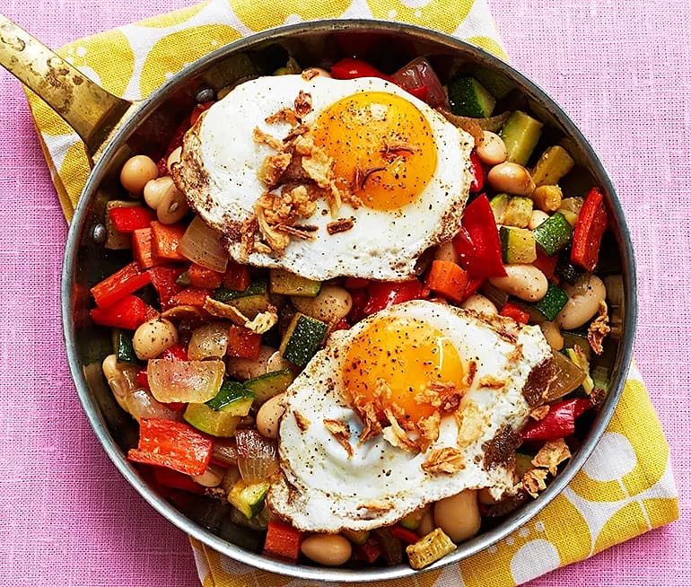 Grönsakspytt med ägg och rostad lök