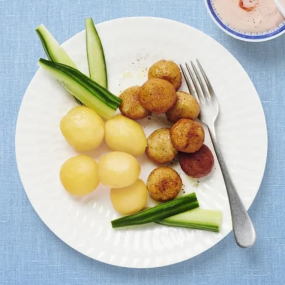 Torskbollar med rosa sås och gurka