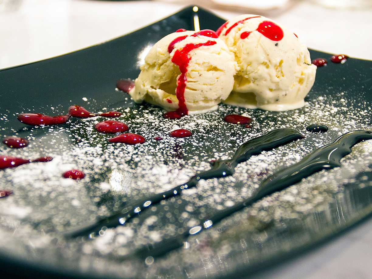 Hemslungad vaniljglass med hallonsky