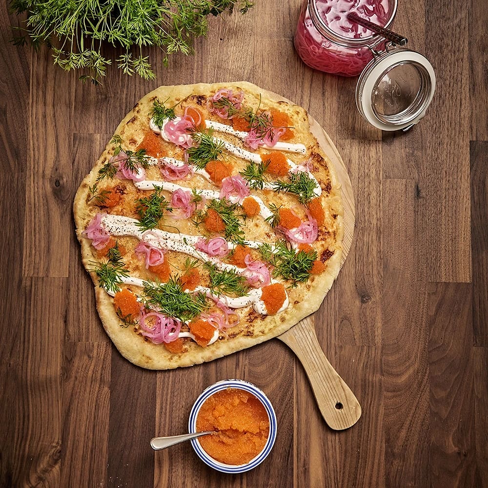 Torsk med ägg, räkor, brynt smör och pepparrot