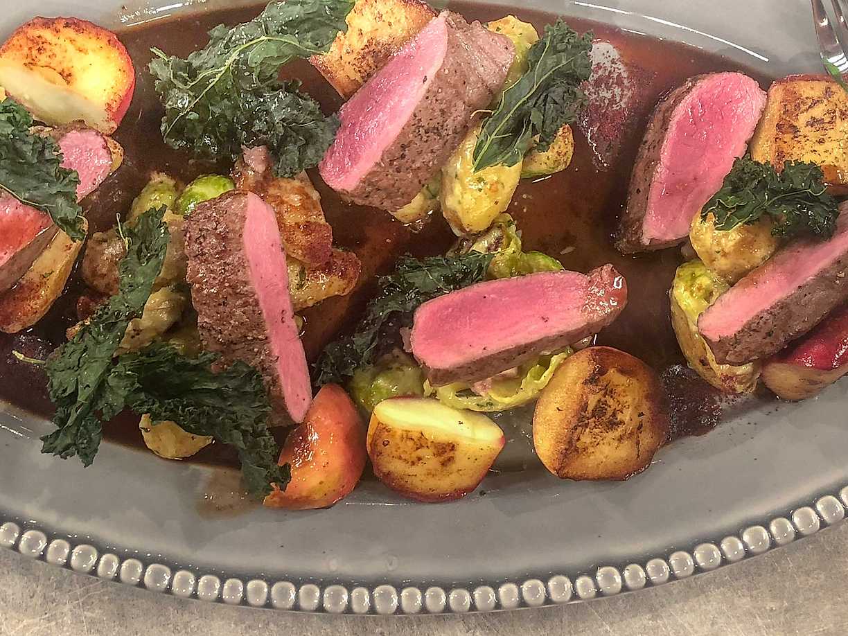 Älgkalvbiff med karamelliserat äpple och brysselkål