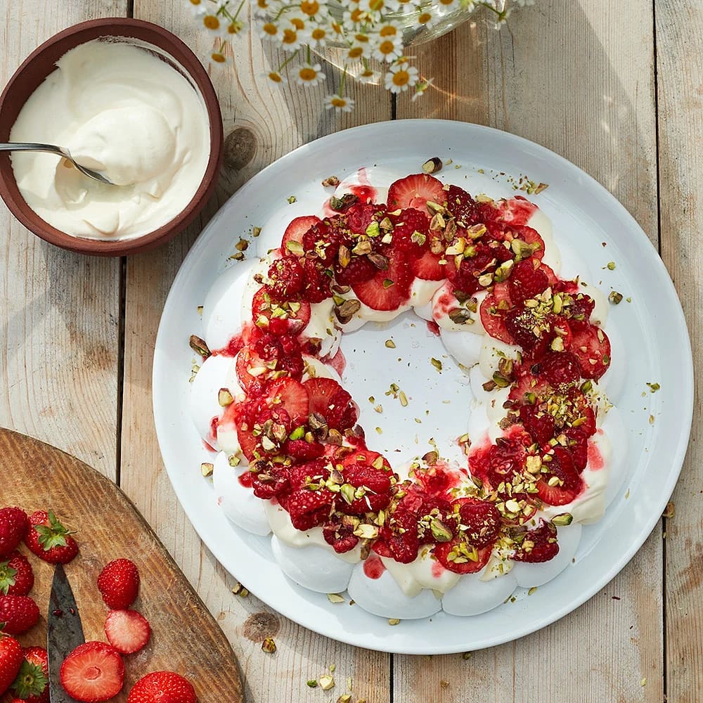 Marängtårta med mjölkchokladtryffel, hallongrädde och färska jordgubbar