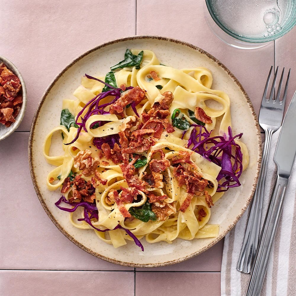 Färskpasta med bacon och ädelost