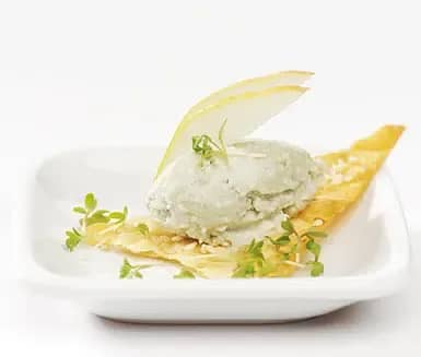 Kassler med spenat- och päronfräs och smulad ädelost