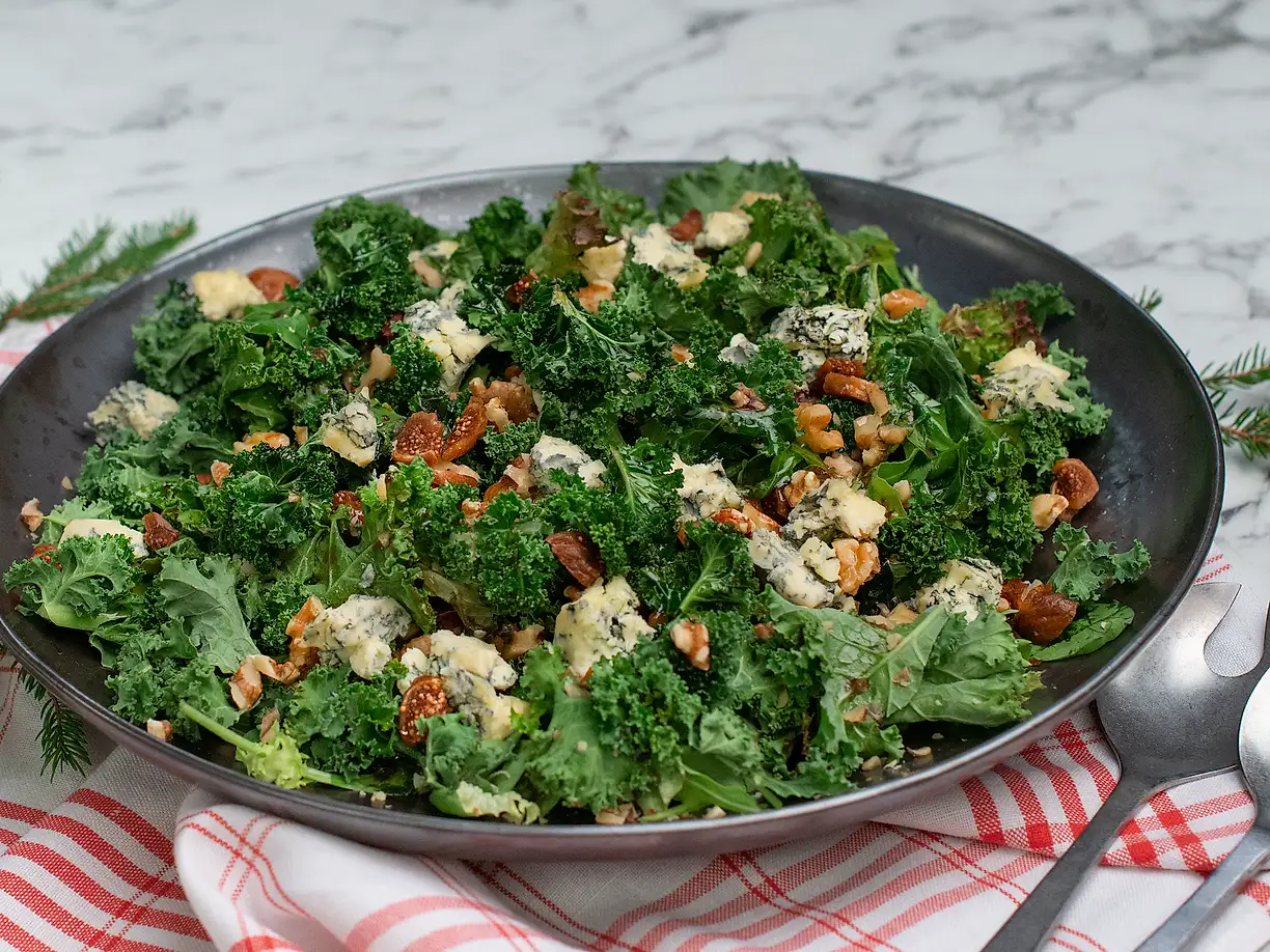 Grönkålssallad med ädelost, fikon och valnötter
