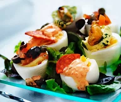 Ägghalvor fyllda med rökt lax och pepparrot eller rökt renstek och äpple
