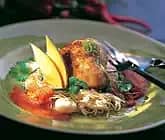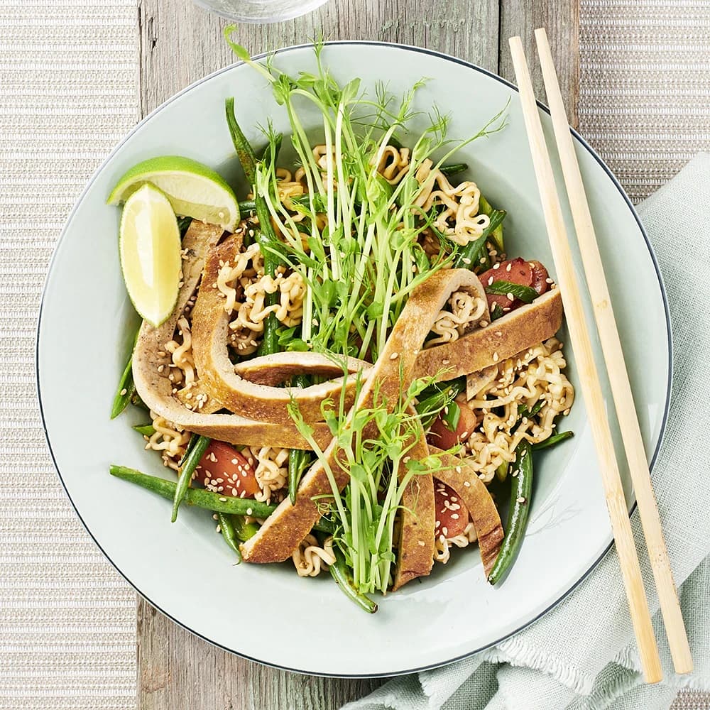 Limekyckling med cherrychilisås, färsk mango och wokade äggnudlar