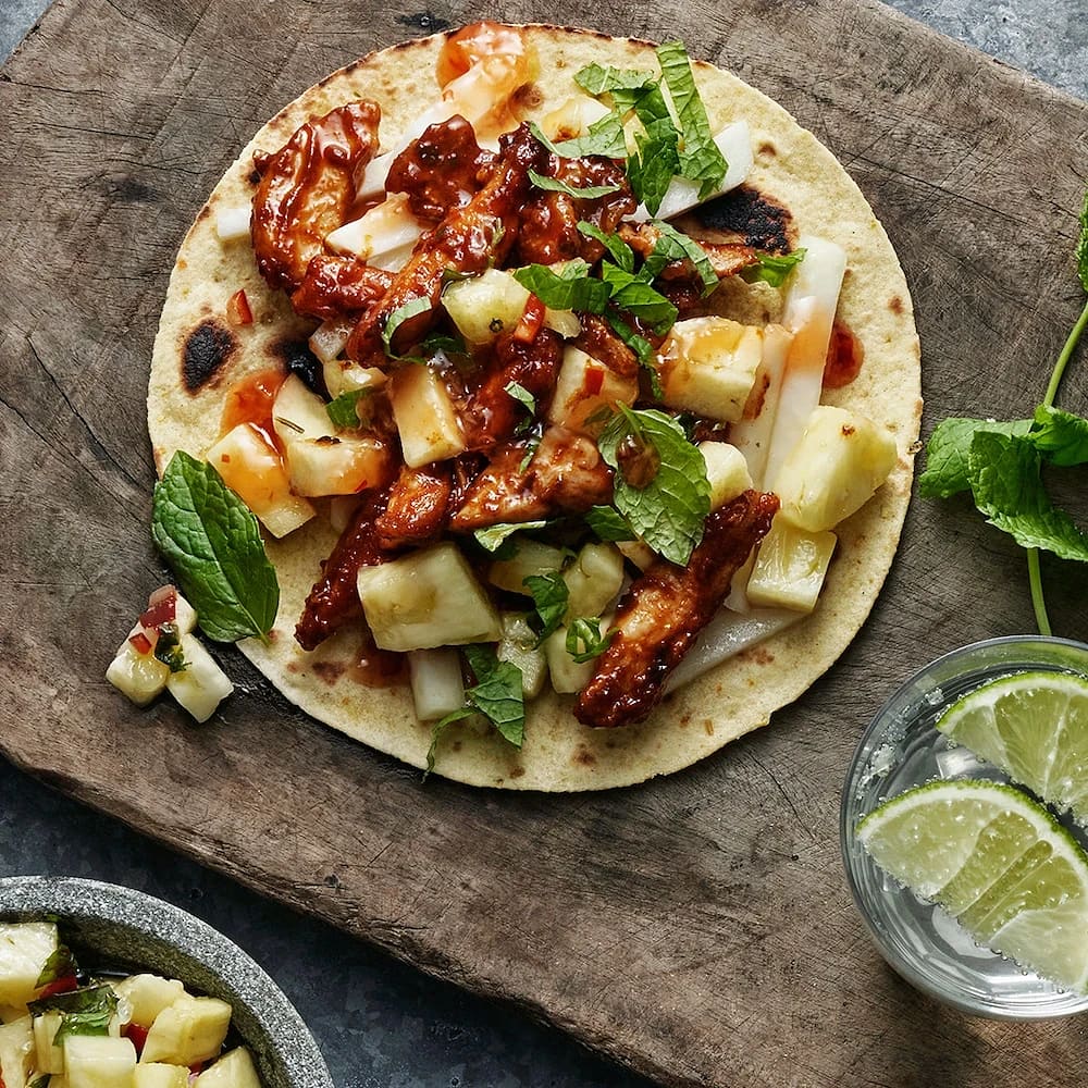 Carnitas med grillad ananassalsa och mexikansk slaw