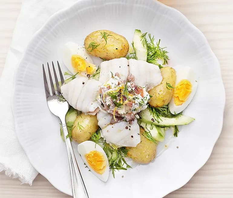 Pocherad torskfilé med ägg, ansjovis och gräslök