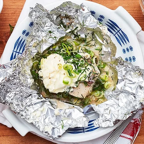 Torsk i folie med ansjovis, dill och crème fraiche