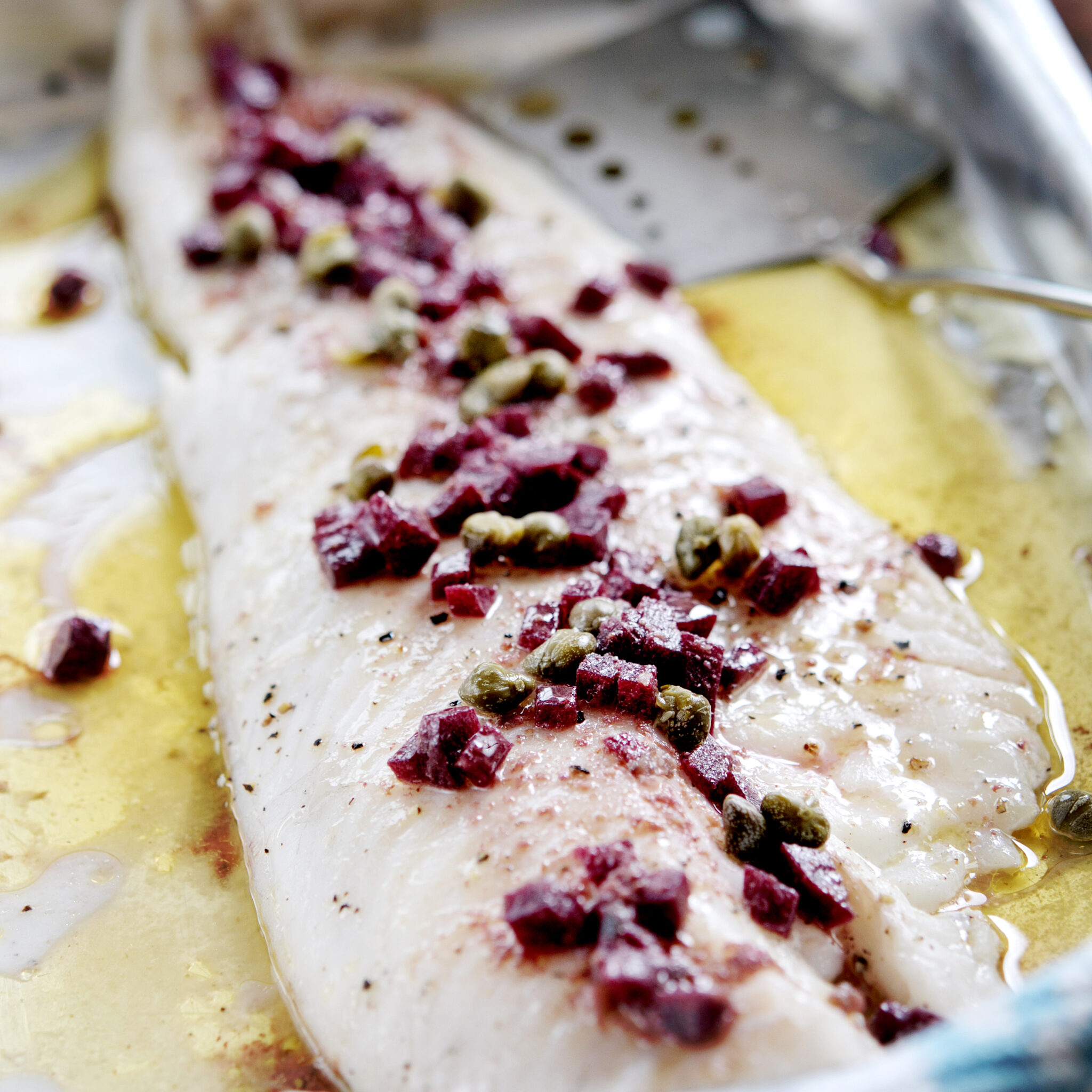 Ugnsbakad bleka med brynt ansjovis- och rödbetssmör