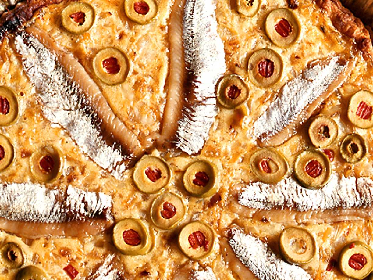 Medelhavspaj med lök, oliver och ansjovis