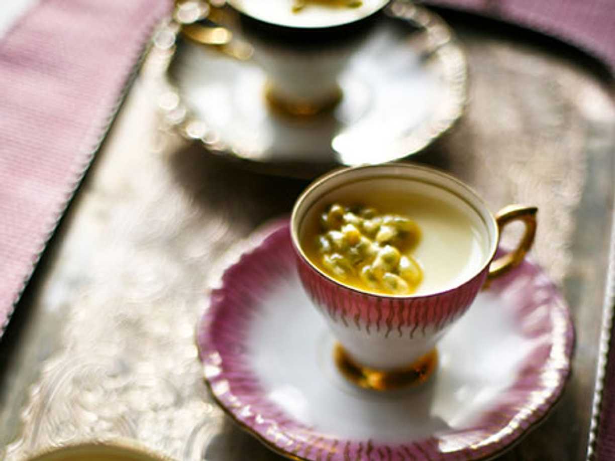 Gräddfilspannacotta med apelsin, vanilj och jordgubbsgelé