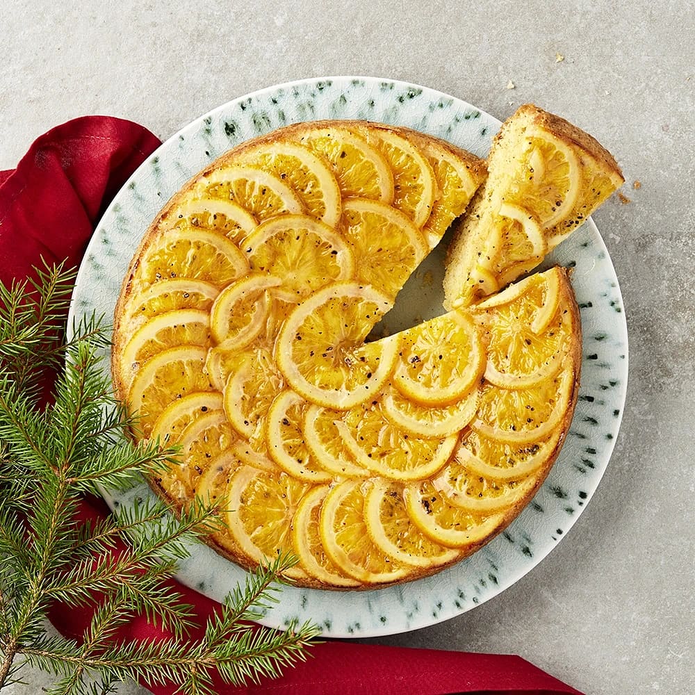Upp och nervänd apelsinkaka med vaniljråkräm