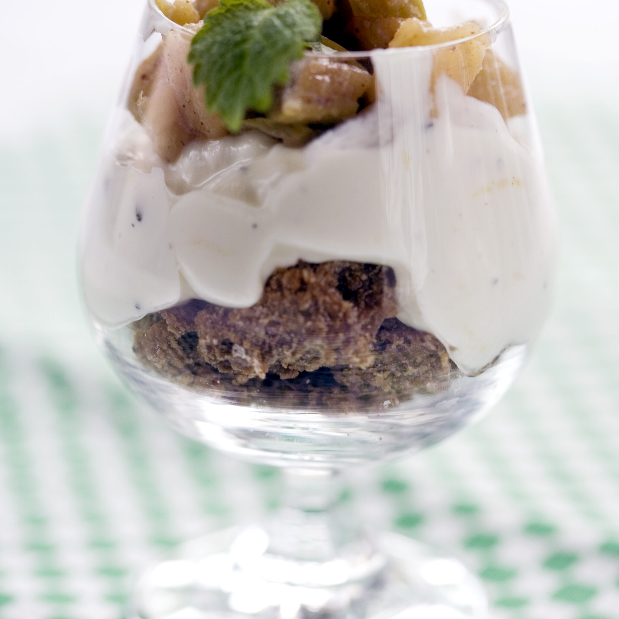 Äppelcheesecake med knaprigt havresmul och kolasås