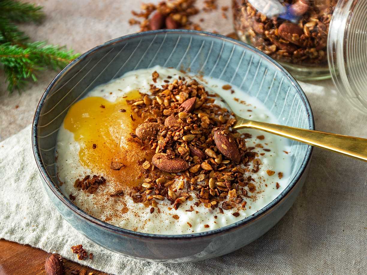 Risgrynsgröt med äppelmos och pepparkaksgranola