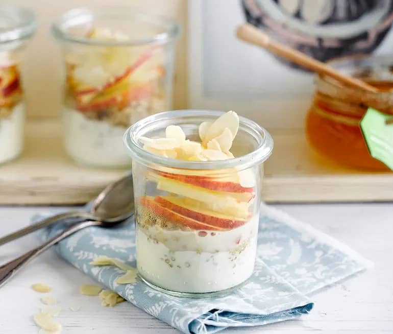 Kanel- och honungsrostad havre och nötter med yoghurt och äpple