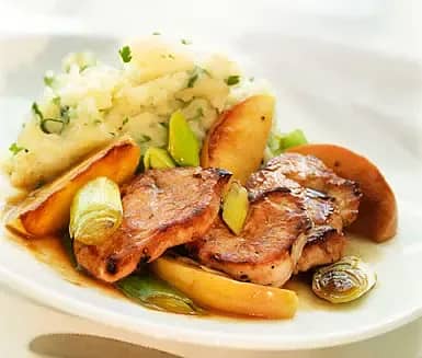 Stekta fläskkotletter med sky, rostad potatis och varma äpplen