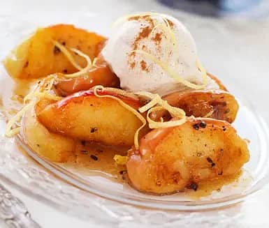 Flamberade äpplen och valnötter, serveras med lyxig vaniljglass