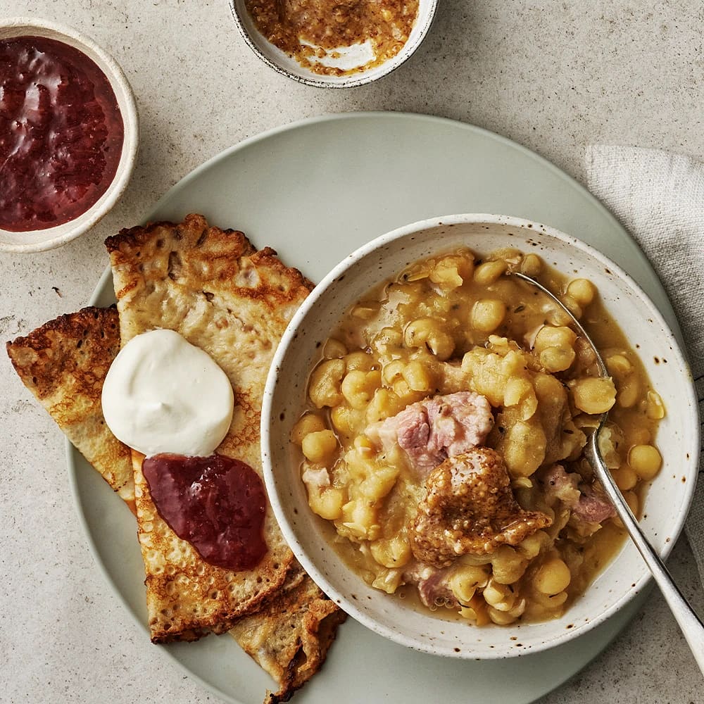 Klassisk ärtsoppa med fläsk, pannkakor och drottningsylt