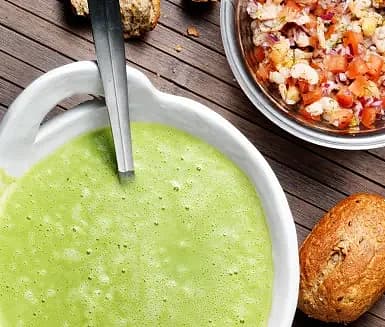 Avokado- och grön ärtsoppa med räkor, ärtskott och chiliflakes