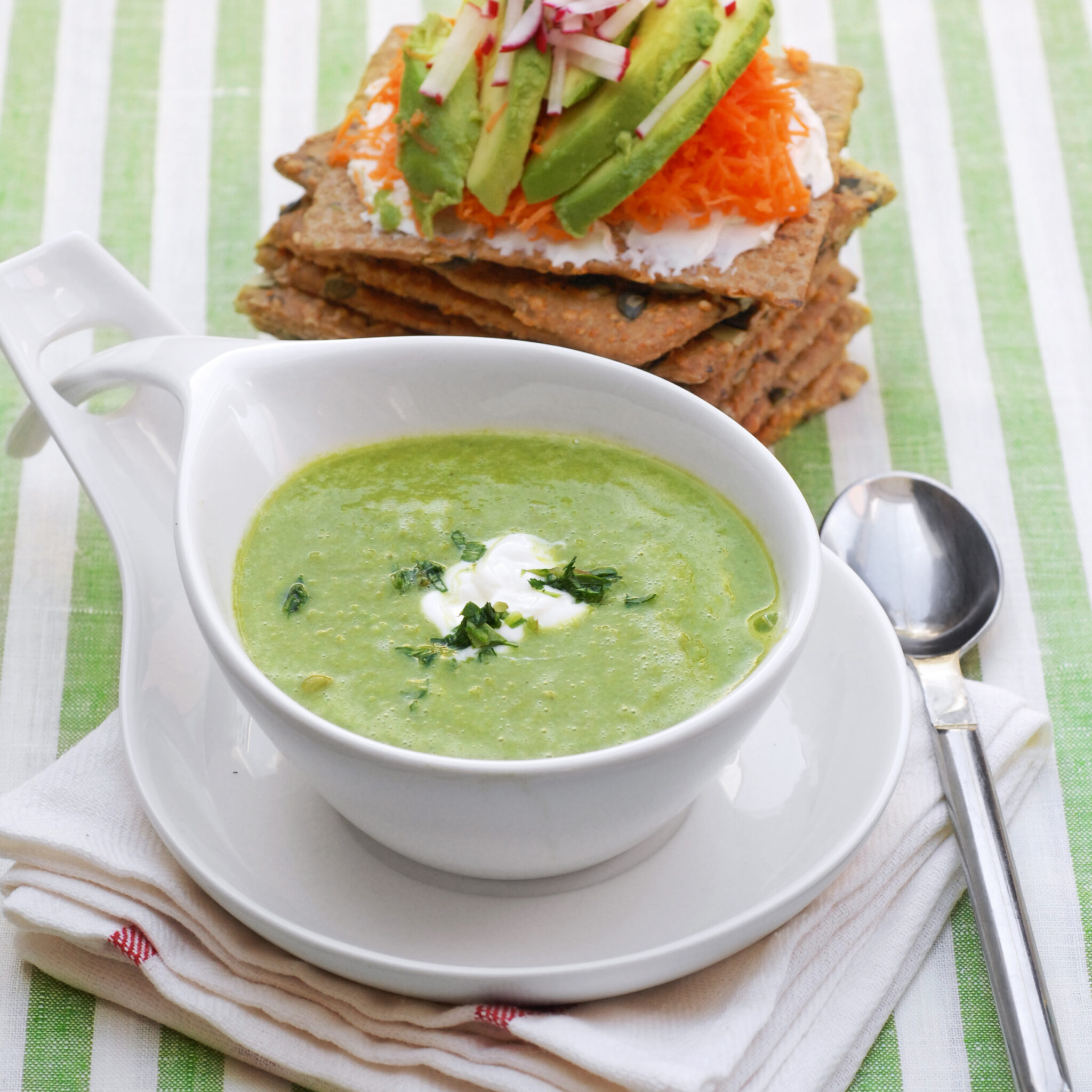 Grön ärtsoppa med krämigt ägg och krispiga krutonger