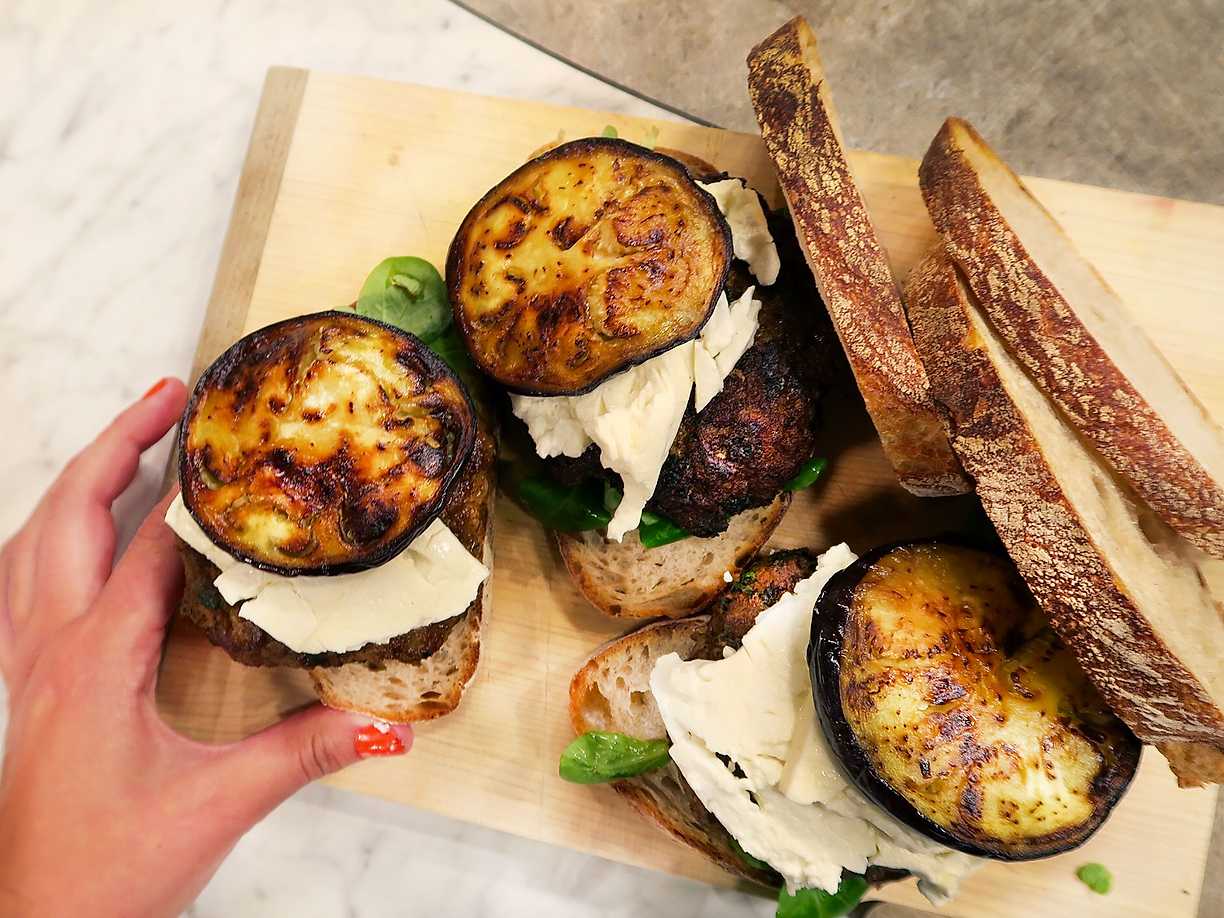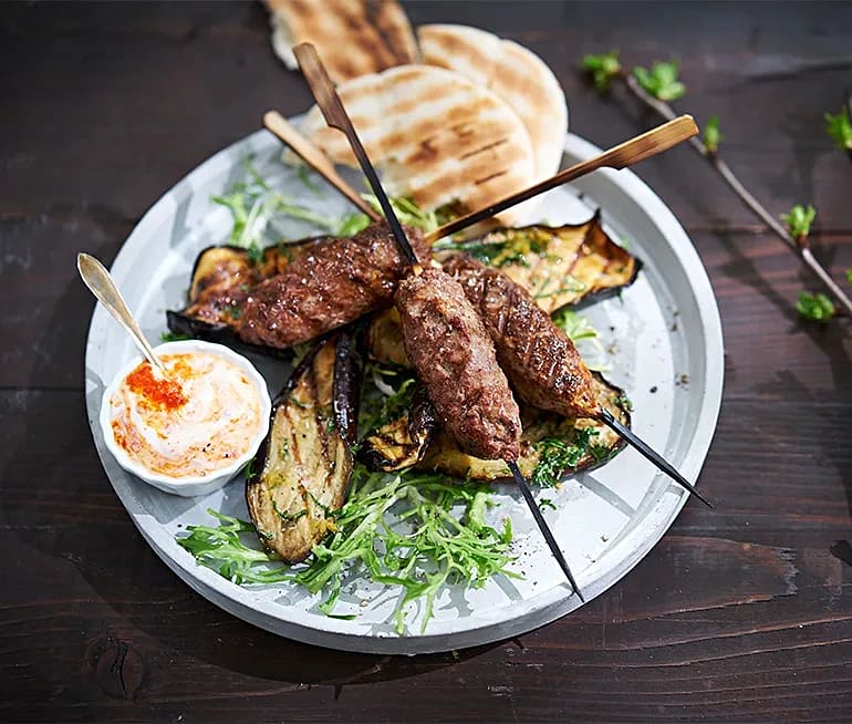 Lammkotletter med rostad aubergine, fetaost och sesamyoghurt